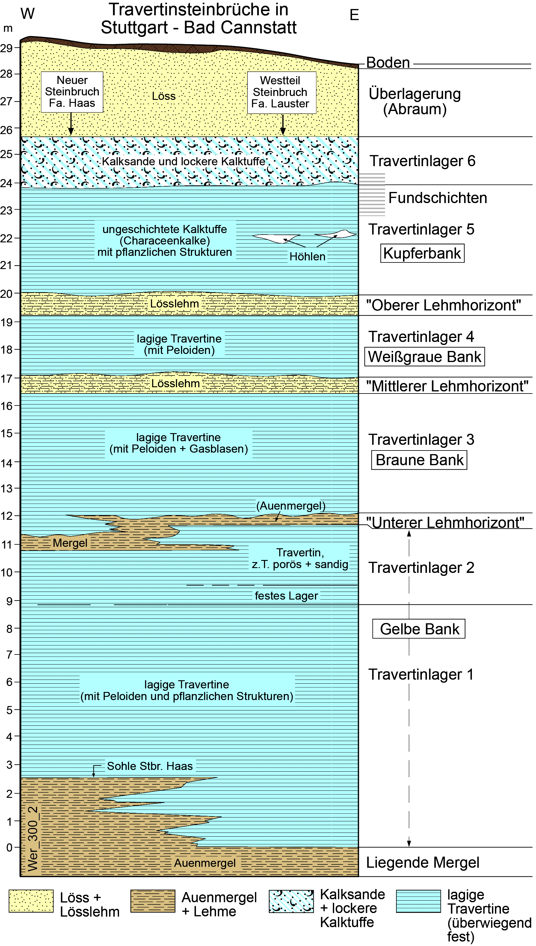 Am besten zu beobachten ist der Travertin heute an der ehemaligen Abbauwand des Neuen Steinbruchs der Firma Haas. Die größte Mächtigkeit des Travertins und der trennenden Lehmhorizonte ist nach der idealisierten Schichtenfolge (s. Abb. rechts) zusammen ca. 2,5 m geringer anzusetzen als im benachbarten Steinbruch Lauster. Der überlagernde Löss ist dagegen um bis 1 m mächtiger. Der Profilaufbau wechselt jedoch in beiden Vorkommen kleinräumig. Die heute erhaltene Wand ist bis etwa 15 m hoch. Wie auch im Steinbruch Lauster wurden besonders in den Travertinlagern 5 und 6 Fossilien gefunden, hier z. B. der Schädel eines Waldelefanten sowie altsteinzeitliche Artefakte aus Feuerstein.
