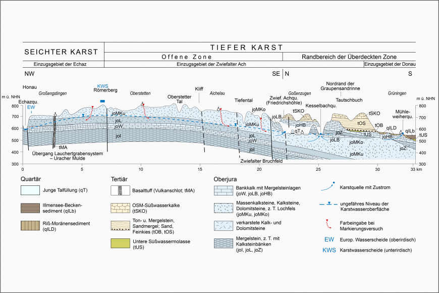 Gliederung der Karstzonen am Beispiel eines geologischen Schnittes durch die Mittlere Schwäbische Alb (Grafik: verändert nach Villinger, 2006b)