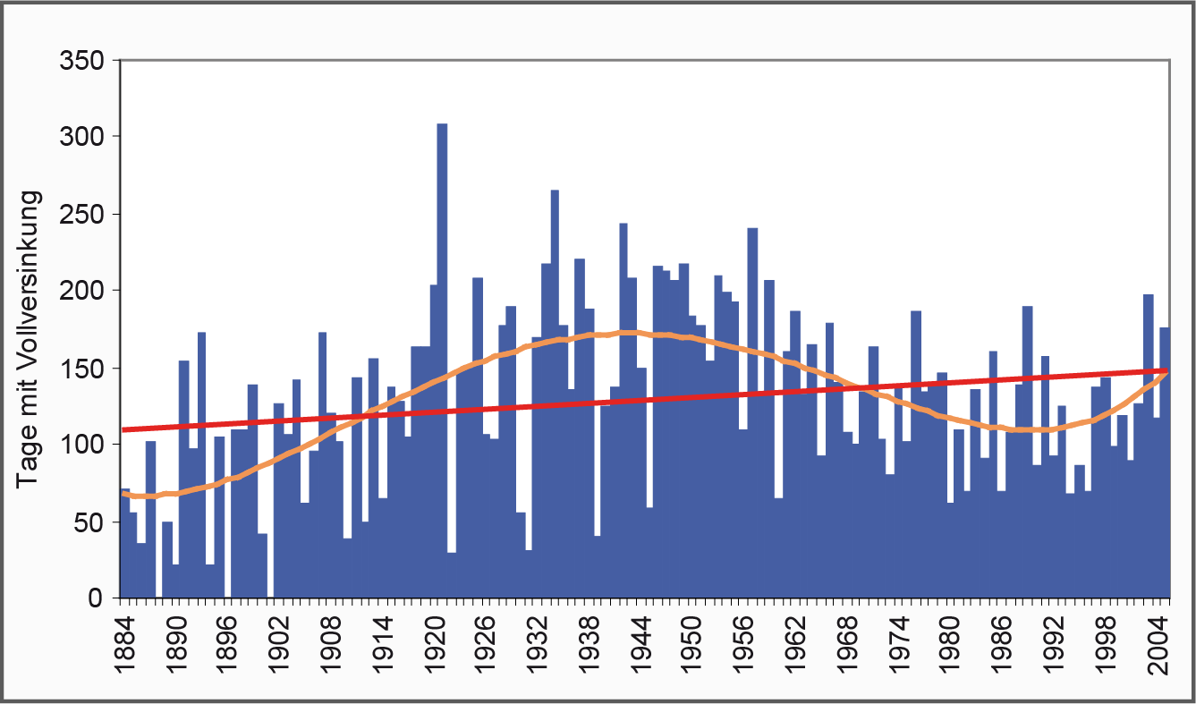 - Im Zeitraum 1973 bis 2002 wurde im Mittel eine Vollversickerung an 115 Tagen beobachtet.
